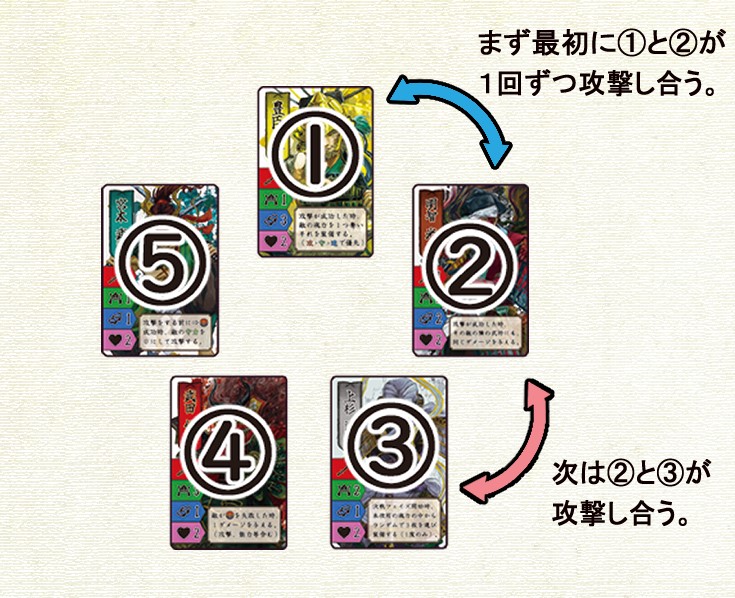 戦闘は、 五角形の隣り合う武将同士が順番に戦います。