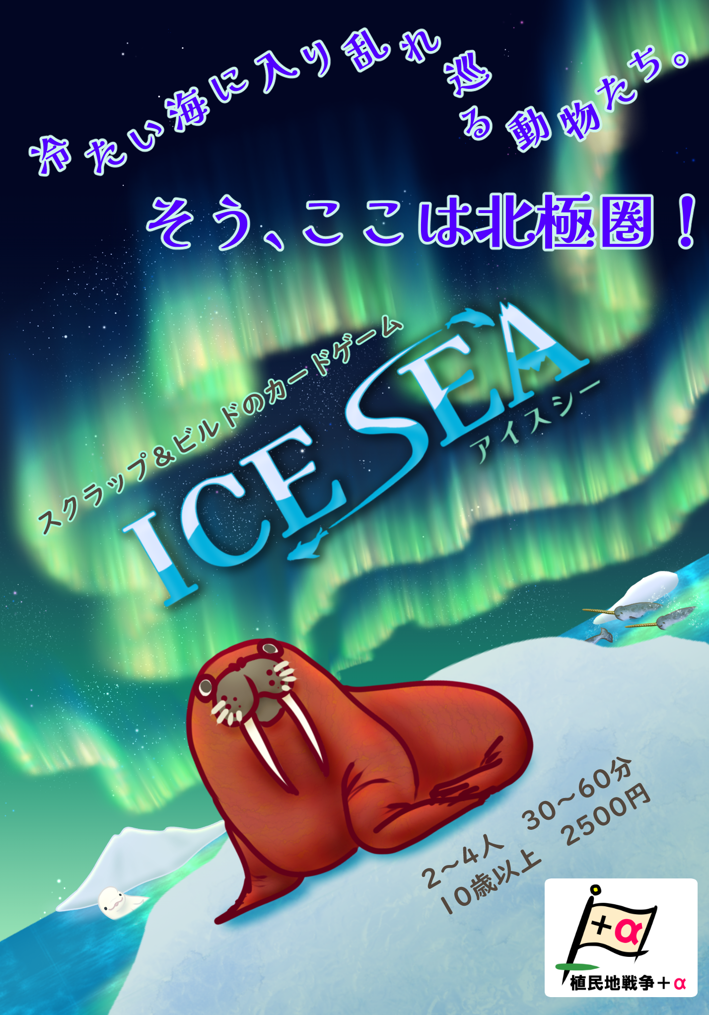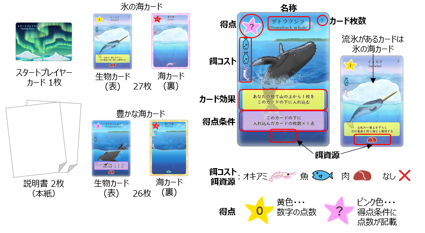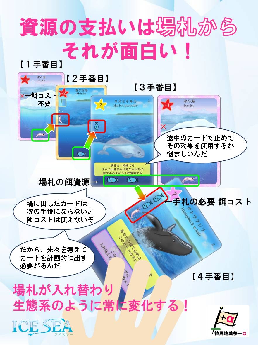 カードは裏向きでも出すことが出来ます。特に「氷の海」の裏(海)側は、餌コストが不要で出せば次の手番からオキアミの餌資源が得られます。また「豊かな海」の裏(海)側は、餌コ