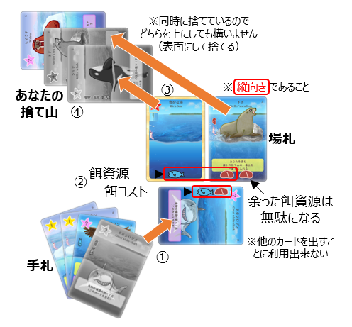 ②出したカードの餌コスト分と、既に出ている場札の餌資源を一致させます