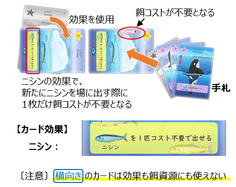 カードの効果ですが、カードには黄色い枠にカード効果が書いてあるものがあり、縦向きの場札を横に傾けることで、その効果を実行することが出来ます。(以下、「ニシン」の効果例)