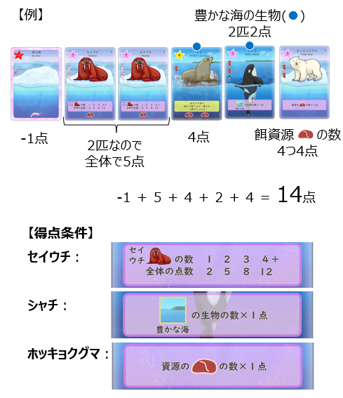 出したカードは個々に得点を持っており、ゲーム終了時に出した全てのカードの合計得点が最も高いプレイヤーが勝利します。