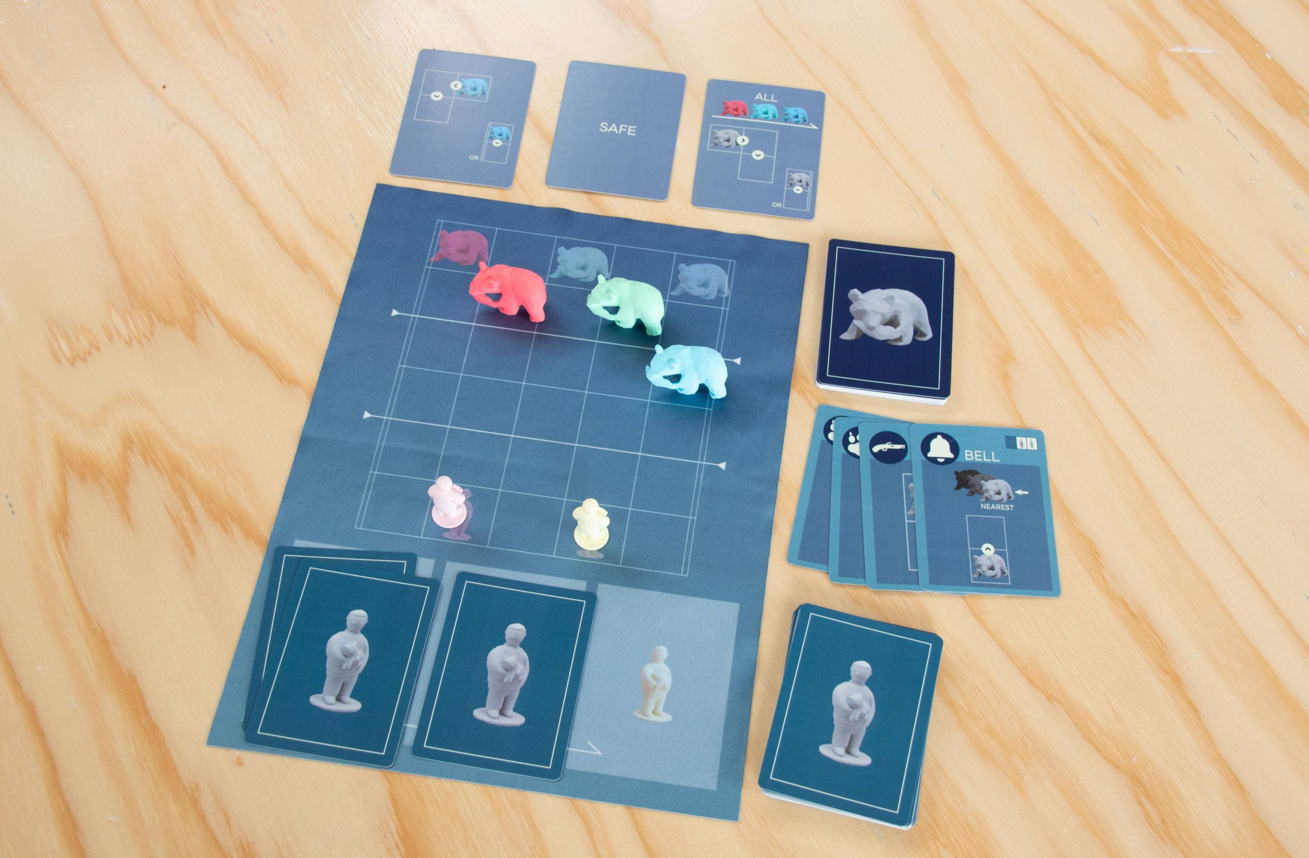クマカードの山札が尽きたら勝利、山札が尽きる前にクマが人間の街まで侵攻した、またはヒト駒のいる場所にクマが侵攻した(=人が熊に襲われた)場合は敗北となります。