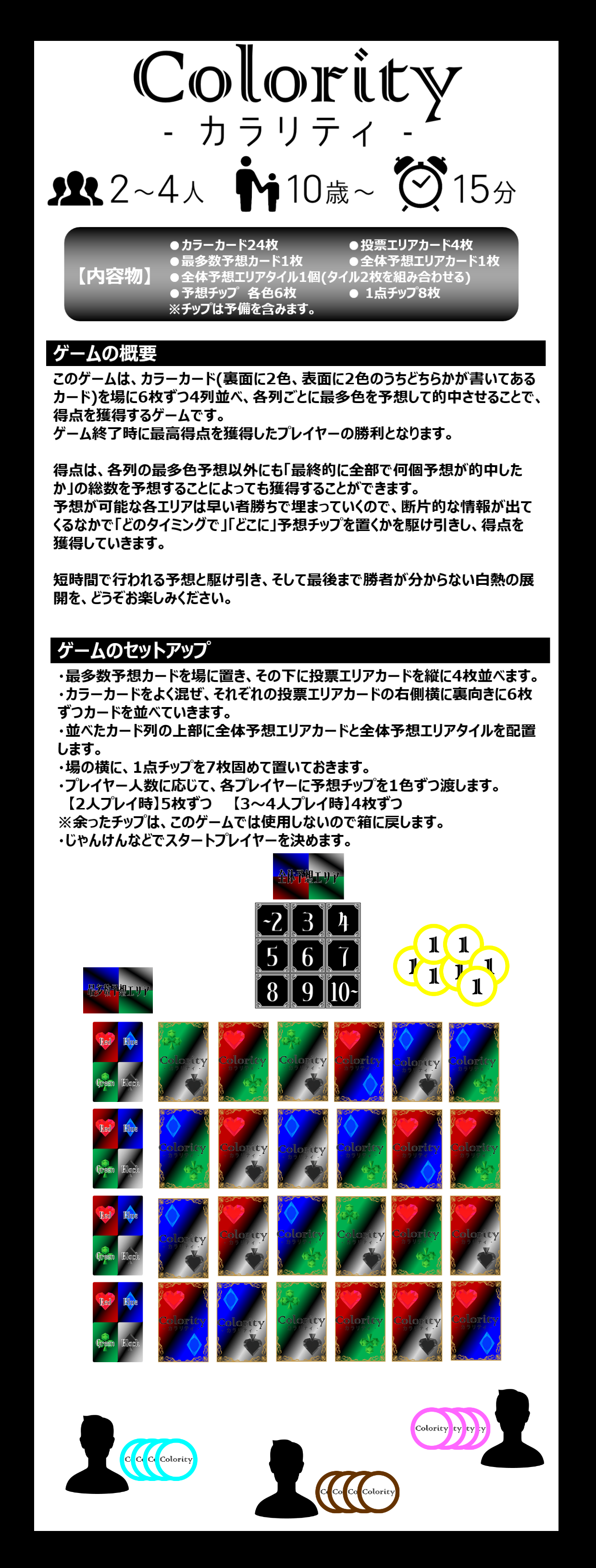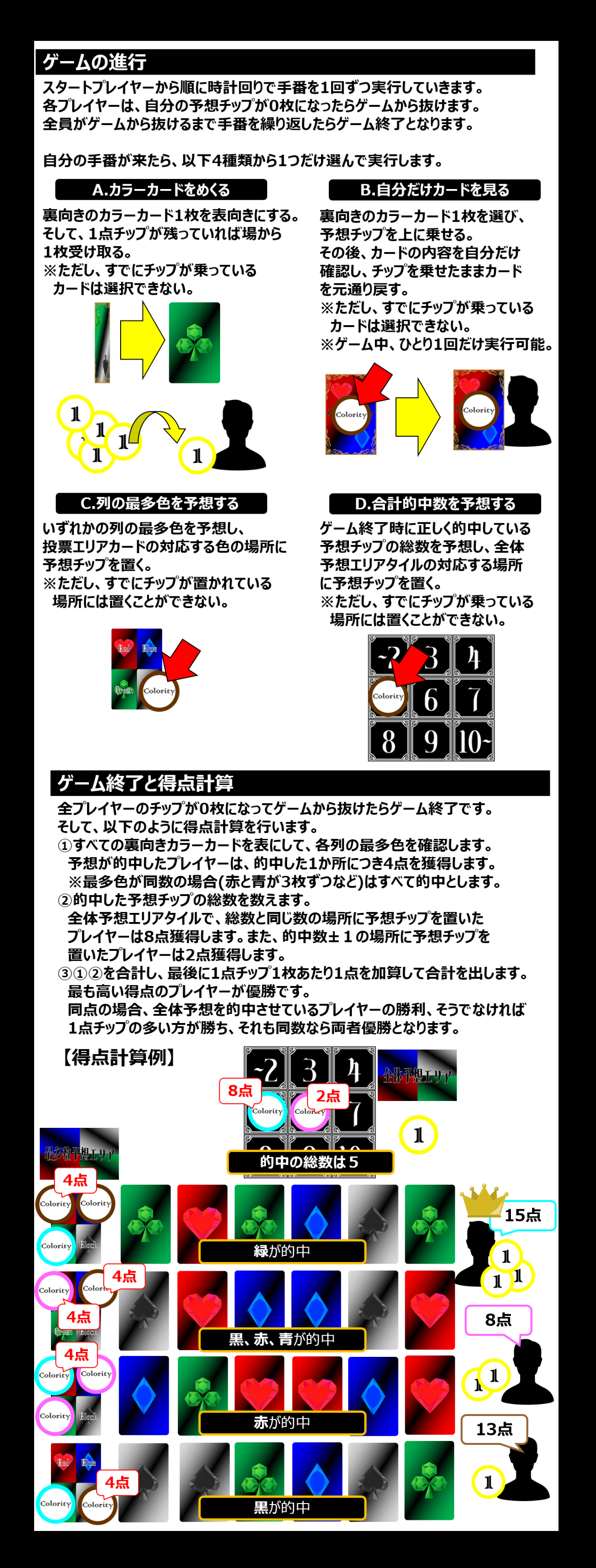 このカードを6枚ずつ4列並べ、各列ごとに最も多い色が何色かを予想して、的中させることで得点を獲得するゲームです。また、「最終的に全部でいくつ予想が的中したか」の全体数を予想することによっても得点を獲得することができます。