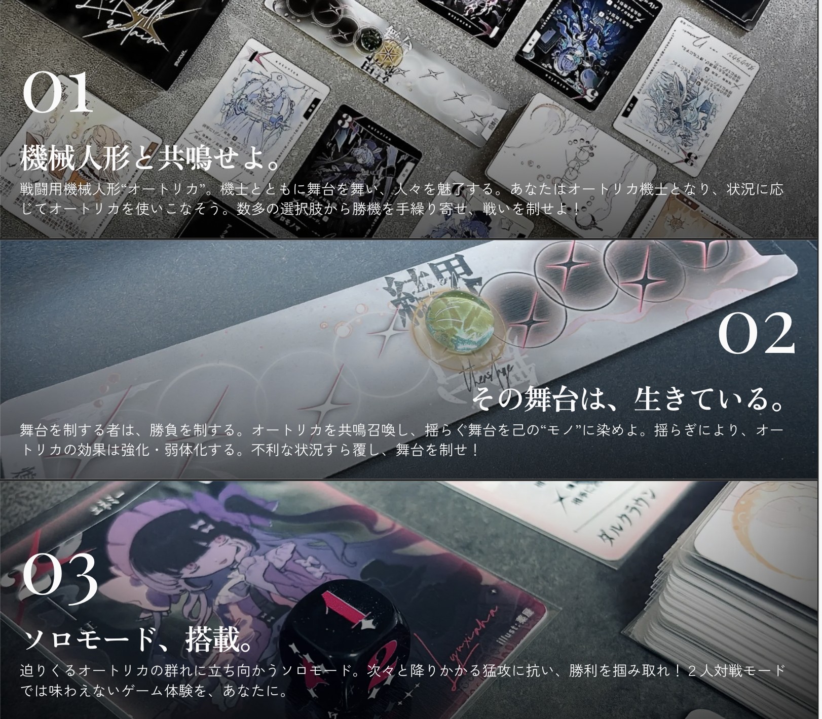 カードを組み合わせ、オートリカと共鳴し戦う機士となれ。属性が揺らぐ舞台では、その能力も大きく変化する。変化を読み切り、勝利を掴もう!